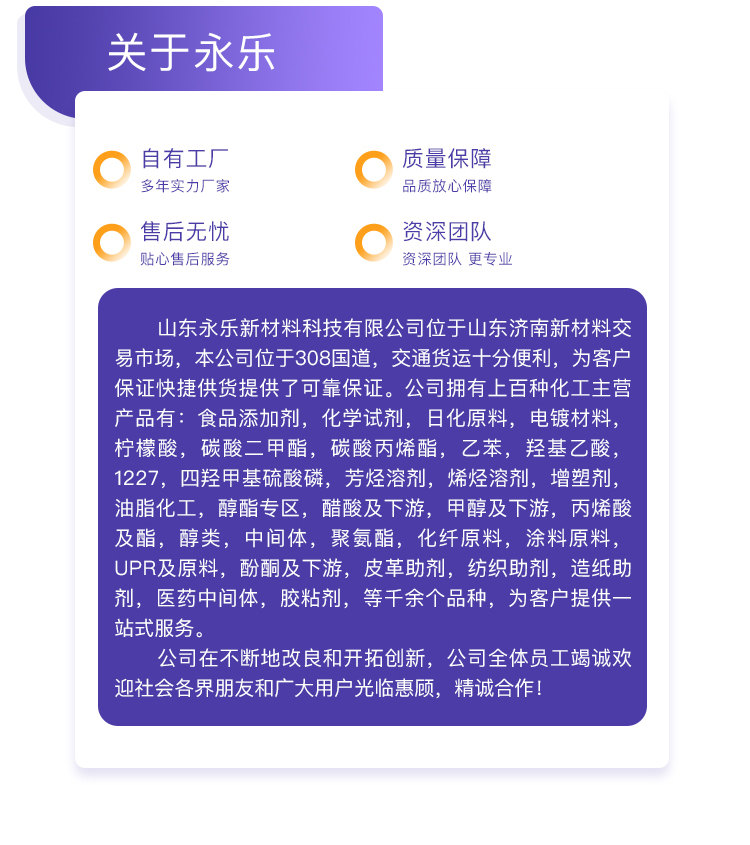 • 山东永乐新材料科技有限公司位于山东济南新材料交易市场,本公司位于308国道,交通货运十分便利,为客户保证快捷供货提供了可靠保证。公司拥有上百种化工主营产品有:食品添加剂,化学试剂,日化原料,电镀材料,柠檬酸,碳酸二甲酯,碳酸丙烯酯,乙苯,羟基乙酸,1227, 四羟甲基硫酸磷,芳烃溶剂,烯烃溶剂,增塑剂,油脂化工,醇酯专区,醋酸及下游,甲醇及下游,丙烯酸及酯,醇类,中间体,聚氨酯,化纤原料,涂料原料,UPR及原料,酚酮及下游, 皮革助剂,纺织助剂,造纸助剂,医药中间体,胶粘剂,等千余个品种...
