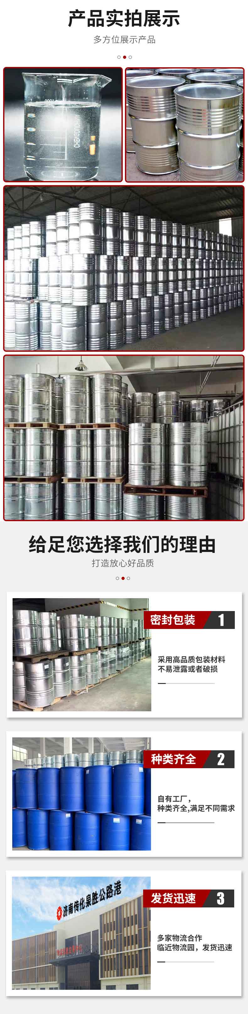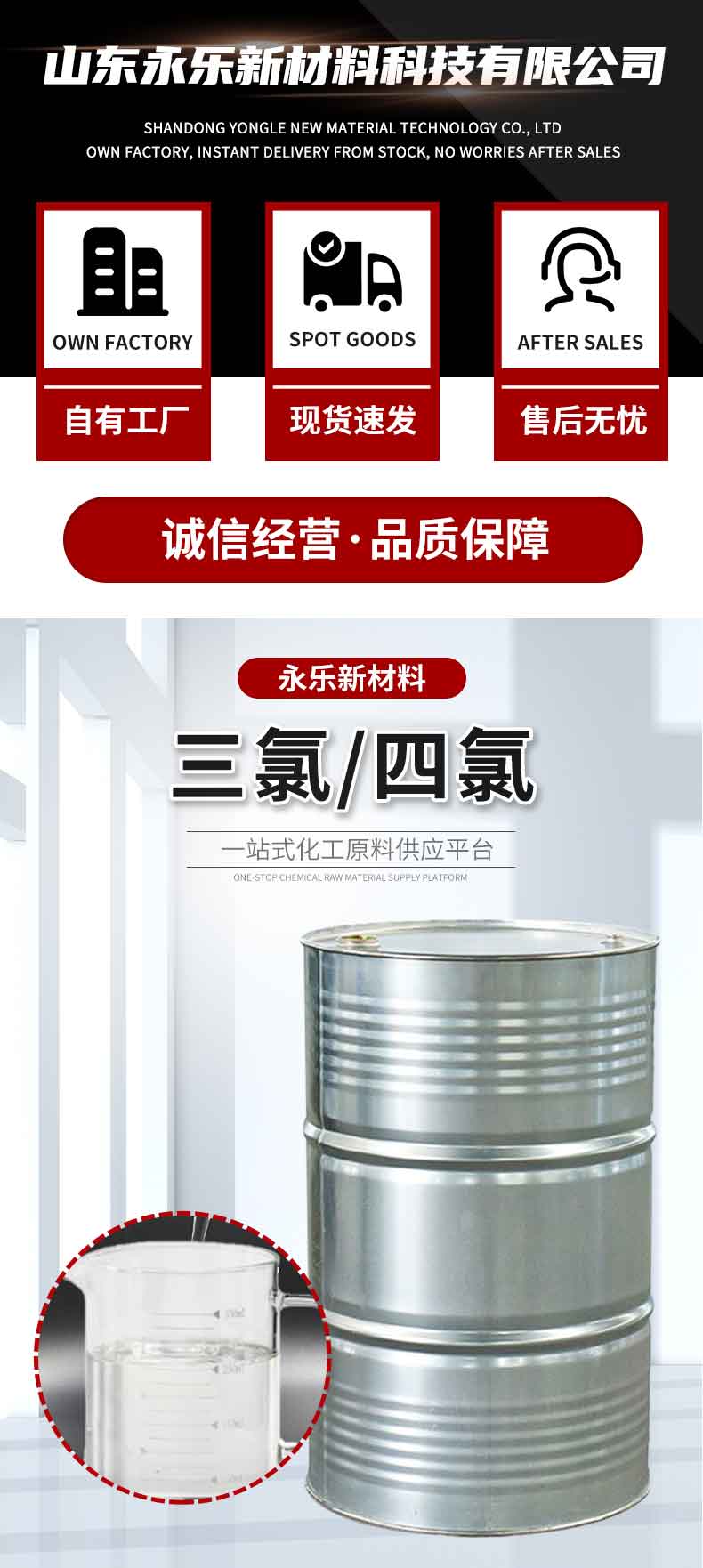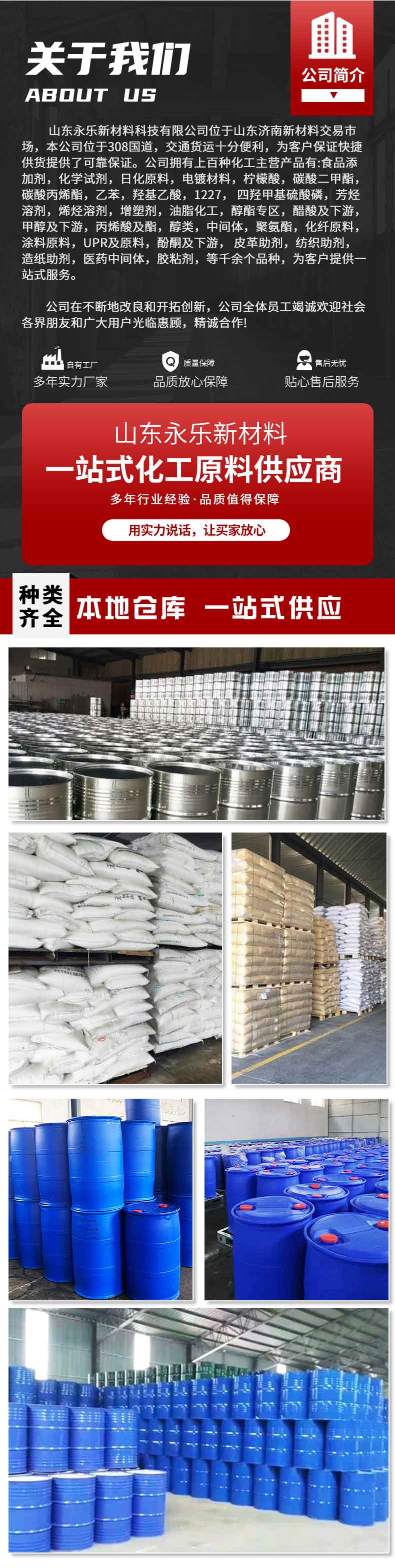 • 山东永乐新材料科技有限公司位于山东济南新材料交易市场,本公司位于308国道,交通货运十分便利,为客户保证快捷供货提供了可靠保证。公司拥有上百种化工主营产品有:食品添加剂,化学试剂,日化原料,电镀材料,柠檬酸,碳酸二甲酯,碳酸丙烯酯,乙苯,羟基乙酸,1227, 四羟甲基硫酸磷,芳烃溶剂,烯烃溶剂,增塑剂,油脂化工,醇酯专区,醋酸及下游,甲醇及下游,丙烯酸及酯,醇类,中间体,聚氨酯,化纤原料,涂料原料,UPR及原料,酚酮及下游, 皮革助剂,纺织助剂,造纸助剂,医药中间体,胶粘剂,等千余个品种...