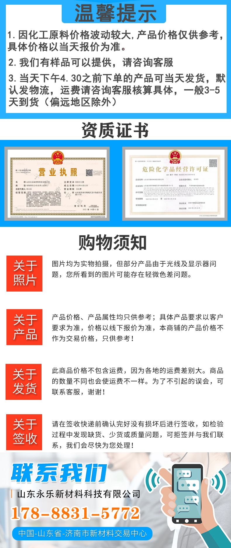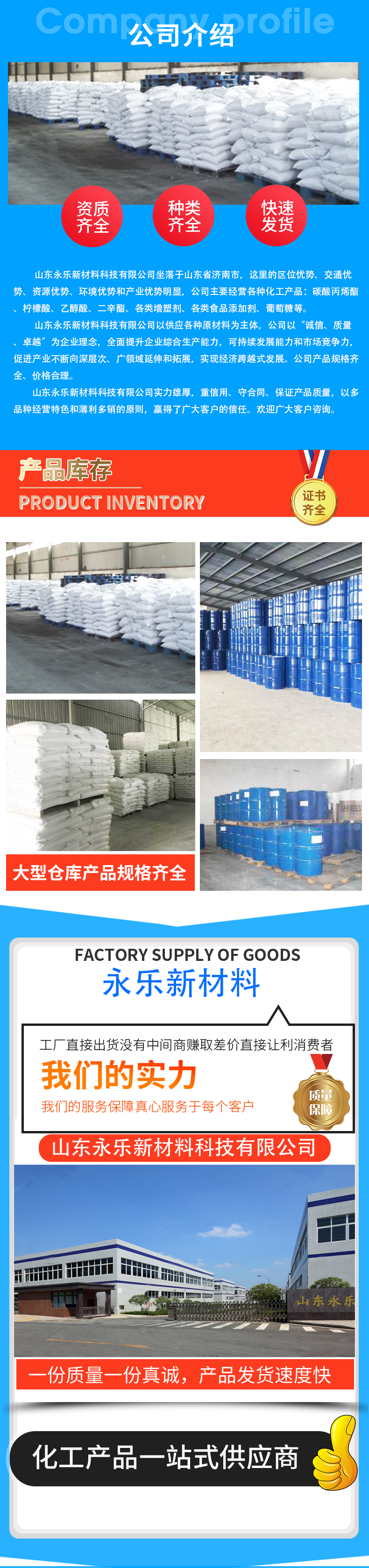 • 山东永乐新材料科技有限公司位于山东济南新材料交易市场,本公司位于308国道,交通货运十分便利,为客户保证快捷供货提供了可靠保证。公司拥有上百种化工主营产品有:食品添加剂,化学试剂,日化原料,电镀材料,柠檬酸,碳酸二甲酯,碳酸丙烯酯,乙苯,羟基乙酸,1227, 四羟甲基硫酸磷,芳烃溶剂,烯烃溶剂,增塑剂,油脂化工,醇酯专区,醋酸及下游,甲醇及下游,丙烯酸及酯,醇类,中间体,聚氨酯,化纤原料,涂料原料,UPR及原料,酚酮及下游, 皮革助剂,纺织助剂,造纸助剂,医药中间体,胶粘剂,等千余个品种...