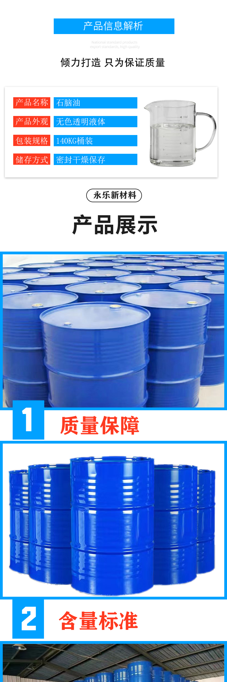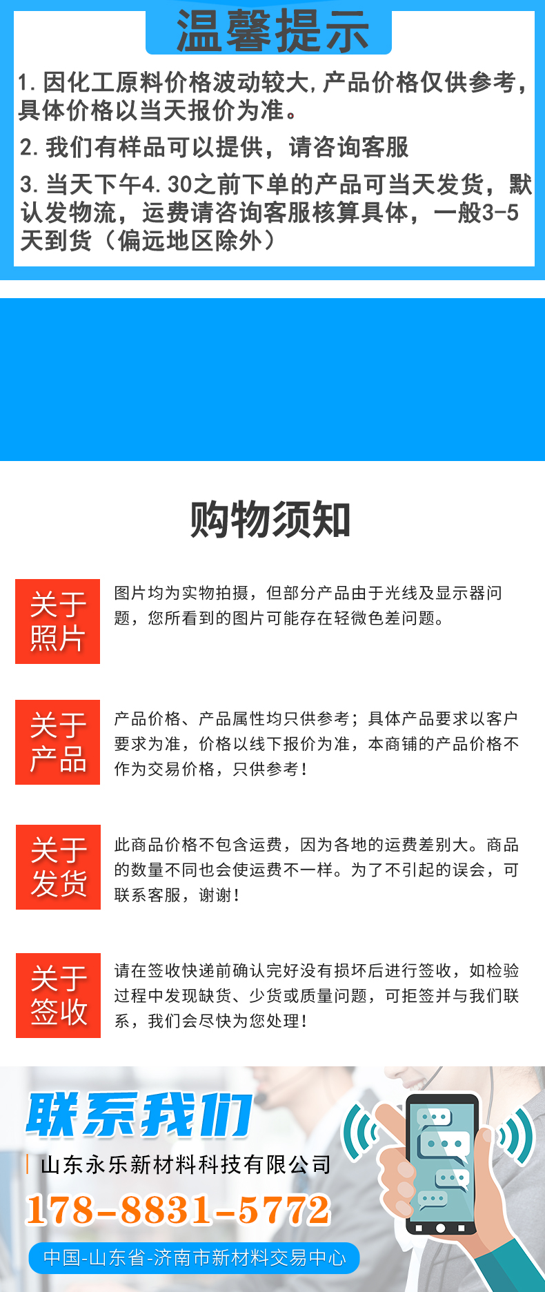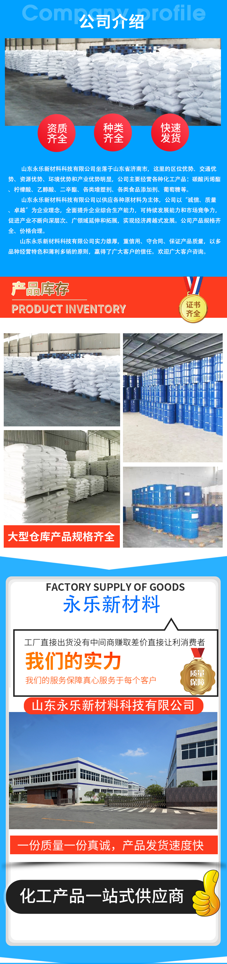• 山东永乐新材料科技有限公司位于山东济南新材料交易市场,本公司位于308国道,交通货运十分便利,为客户保证快捷供货提供了可靠保证。公司拥有上百种化工主营产品有:食品添加剂,化学试剂,日化原料,电镀材料,柠檬酸,碳酸二甲酯,碳酸丙烯酯,乙苯,羟基乙酸,1227, 四羟甲基硫酸磷,芳烃溶剂,烯烃溶剂,增塑剂,油脂化工,醇酯专区,醋酸及下游,甲醇及下游,丙烯酸及酯,醇类,中间体,聚氨酯,化纤原料,涂料原料,UPR及原料,酚酮及下游, 皮革助剂,纺织助剂,造纸助剂,医药中间体,胶粘剂,等千余个品种...